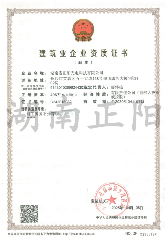 湖南省正陽光電科技有限公司是一家從事亮化工程及大型燈光藝術(shù)的設(shè)計(jì)、制作、安裝和維護(hù)于一體的專業(yè)化公司。公司資質(zhì)齊全、管理嚴(yán)謹(jǐn)、技術(shù)先進(jìn)、實(shí)力雄厚,取得了城市及道路照明工程專業(yè)承包壹級(jí)資質(zhì)、照明工程設(shè)計(jì)專項(xiàng)甲級(jí)資質(zhì)、機(jī)電工程施工總承包貳級(jí)資質(zhì)、施工勞務(wù)等資質(zhì)、國家高新技術(shù)企業(yè)、國家“重質(zhì)量·守誠信”示范企業(yè)。